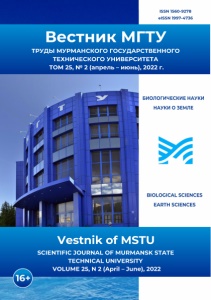 ISSN 1560-9278 elSSN 1997-4736 Вестник МГТУ ТР УДЫ М УРМ АНСКО ГО ГО С УД А Р С ТВ ЕН Н О ГО ТЕХНИЧ ЕСКО ГО УНИВ ЕРСИ ТЕ ТА ТОМ 25, № 2 (апрель - июнь), 2022 г БИОЛОГИЧЕСКИЕ НАУКИ НАУКИ О ЗЕМЛЕ І!І А 1A 5 [ BIOLOGICAL SCIENCES EARTH SCIENCES Vestnik of MSTU SCIENTIFIC JO UR N A L OF MURMANSK STATE TECHN ICAL UN IVERS ITY VO LUM E 25, N 2 (April - Jun e ) , 2022 16 +