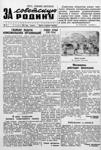 СМЕРТЬ НЕМЕЦКИМ ОККУПАНТАМ! иА РОДИН І І К Р А С Н О Ф Л О Т С К А Я Г А З Е Т А N9 31 5 и ю н я 1945 года, вторник. Прочти и передай тоаарищу „Советское общество живет еди­ ными общими интересами, едиными целями, едиными устремлениями. Поэтому у такого общества армия и народ—это одна сила. У такого общества фронт и тыл—это единая сила. В этом сила нашего общества, в этом его непобедимость!“ (ИЗ ПЕРЕДОВОЙ „ПРАВДЫ") ГЛАВНАЯ ЗАДАЧА КОМСОМОЛЬСКИХ ОРГАНИЗАЦИЙ Улучшение массовой политн- 1 ко-воспитательной работы среди молодежи, является сейчас ос­ новной задачей, поставленной X III пленумом ЦК ВЛКСМ пе­ ред комсомольскими организа­ циями. С момента опубликования ре­ шений пленума прошло доста­ точно времени для того, чтобы судить в какой степени комсо­ мольские организации сумели понять то новое, на что наце­ лил комсомол его ЦеитралышЗ Комитет. Надо прямо сказать—сделан- пое еще не дает оснований го­ ворить, что комсомольские орга­ низации корабля по-настоящему взялись за реализацию реше­ ний X III пленума ЦК ВЛКСМ. Это лишь первые шаги в раз­ вертывании большой воспита­ тельной работы с молодежью, Которую должен возглавить ком­ сомол. Что уже сделано? Созданы и занимаются два кружка по изу­ чению книги товарища Сталина ,,0 Великой Отечественной войне Советского Союза",два географи­ ческих кружка и один по изуче­ нию истории нашей Родины; про­ ведено три лекции на естествен­ но-научные темы. И это все, если не считать посещения ком­ сомольцами занятий в сети пар­ тийного просвещения. В комсо­ мольской организации, которую возглавляет т. Сандетский, до сих пор не создано ни одного кружка, хотя комсомольское бю­ ро по этому вопросу вынесло свое решеняе.Тов.Сандетский раз­ говорами об отсутствии времени старается просто прикрыть соб ственную неповоротливость. У нашей молодежи огромная тяга к знанию. Решения пленума как раз п наиравлены на удовлетворение этого стрем­ ления. Плох тот комсомольский руководитель, который стоит в стороне от этой большой и бла­ городной работы. „Пленум обязывает комсо­ мольские организации постоян­ но воспитывать у молодежи лю­ бовь к чтению". В этом отно­ шении огромную роль должен сыграть библиотечный актив. Такой актив есть, но работа его еще не организована. А поле деятельности открывается пе­ ред ним широкое: „руково­ дить самостоятельным чтением книг молодой;ыо, проводить соб­ рания читателей, обсуждение книг, литературные вечера, встречи с писателями". (Из ре­ шений X III пленума ЦК ВЛКСМ). Естественно-научная пропа­ ганда также до сих пор не за­ няла в планах комсомольской работы подобающего ей места. Лекции проводятся от случая к случаю, хотя молодежь прояв­ ляет к ним исключительно вы­ сокий интерес. Законно потре­ бовать от комсомольского бюро корабля большей инициативы в этом вопросе. Много еще надо сделать и в отношении воспитания у ком­ сомольцев стремления постоянно повышать свою политическую подготовку. Не так давно на комсомольском собрании (ком­ сорг т. Богомолов) заслушива­ лись доклады тт.' Чудович, Теребплова и Ульяненковаотом, как они пополняют свои поли­ тические знания. Сказать им было нечего. Собрание обязало их заниматься. Однако, никто из них не сделал из этого нуж­ ных выводов. Решения X III пленума ЦК ВЛКСМ—программа работы не только для комсомольских руко­ водителей, по и для каждого комс