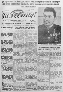 Да здравствует 1 -е Мая-день всех *: : . ' і ] боевы: борьбы щш изщкНюшхггсш рэлвтарии Герой Советского Союза Б. Ф . Сафонов. Летчики-североморцы бьют врага в воздухе и на земле Смело штурмовали врага на ши летчики. Несколько заходов сделали они. Фашисты понесли не малые потери. Когда зада ние было выполнено, завязал ся большой воздушный бой. Около 50 наших и фашист ских истребителей участвовало в нем. Бой шел на низкой высоте в двух местах. Шесть наших летчиков, в том числе тт. Самохин, Ткаченко и Алексеев, сражались против 12 стервятников. Несколько фа шистских коршунов атаковали самолет Самохина. Летчик по шел на хитрость. Он спикиро вал и прижался к реке. Винт уже рубил воду. Всплески ле тели во все стороны. Казалось еще мгновение и самолет ныр нет в водяную пучину. Но трудно было провести нашего летчика. Сильным движением Самохин потянул ручку на себя и, поймав в прицел «Ме-109», ударил из всех пу леметов. Стервятник загорелся и упал в сопки. Умело и мужественно дра лись летчики Ткаченко и Алек сеев. Оба они сбили но «Мес- сершмитту-109». Ожесточенный бой разгорел ся в другом месте. Молодой летчик - комсомолец Евгений Евстигнеев, поймав в сетку прицела одного «Ме-109», дал по нему две очереди. «Мессер- шмитт» перевернулся вверх колесами и на мгновение беспомощно повис в воздухе, а затем с дымом пошел вниз и врезался в землю. Умелой атакой летчик Ор лов сбил второго «Мессер- шмитта-109». Это пятый стер вятник, сбитый гвардейцем Ор ловым. Одного «Ме-109» сбил летчик т. Бокий, награжденный орденом Красного Знамени. Воздушный бой еще раз по казал смелость и мастерство наших летчиков. Фашисты пос ле него не досчитались шести «Ме-109». К # Ф В этот же день рано утром группа наших «ястребков» во главе с летчиком орденоносцем Амосовым вылетела на выпол нение боевого задания. Небо было ясное, безоблачное. Моло дой пилот Чепурнов вниматель но вглядывался в голубую бездну неба, и эта осмотри тельность помогла ему первым заметить истребителей против ника. Чепурнов дал сигнал командиру и смело пошел в атаку. Приблизившись на ма лую дистанцию Чепурнов из своих пулеметов насмерть пронзил врага. Сбил один «Ме-109» в этом же бою отважный летчик т. Курзенков. Сильные повреж дения одному фашистскому истребителю нанес летчик т. Страхов. # * * Всего за этот день было сбито восемь фашистских само летов. Враг получил очеред ной урок. К . Зародов. СМЕРТЬ НЕМЕЦКИМ ОККУПАНТАМ! № 33 К Р А С Н ОФ Л О Т С К А Я Г А З Е Т А П о сл е прочтения уничтожить. ПОД ЗНАМЕНЕМ ЛЕНИНА—СТАЛИНА ВПЕРЕД, НА РАЗГРОМ НЕМЕЦКИХ ЗАХВАТЧИКОВ! За нашу победу! 1 Мая—день смотра бое вых сил рабочего класса- в нынешнем году советский народ встречает в суровой обстановке великой отечест венной войны, в обстановке победоносного наступления Красной Армии и Военно- Морского Флота против гит леровских банд насильни ков, грабителей и убийц. В славную историю борьбы за отчизну летчики-северо морцы вписали не одну зо лотую страницу. Вместе с наземными частями Красной Армии, отрядами морской пехоты и боевыми корабля ми Северного флота они от стаивали родное советское Заполярье от фашистских банд. В многочисленных боях с немецкими оккупантами, не щадя своих сил, крови и самой жизни, сталинские соколы по-гвардейски, по- сафоновски громили и унич тожали обнаглевшего врага. До 260 уничтоженных само лета противника, 3 потоплен ных фаши
