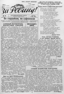зэЙЬСІ3 0 ___ СМЕРТЬ НЕМЕЦКИГѵІ ОККУПАНТАМ! N° 41 К Р А С Н О Ф Л О Т С К А Я Г А З Е Т А П р о ч и та й и п ередай т о в а р и щ у . С р е д а июня 1942 г. По-гвардейски, по-сафоновски ТОЛЬКО ЗА ОДИН ИЗ ПОСЛЕДНИХ ДНЕЙ ЛЕТЧИКИ - СЕВЕРОМОРІ [Ы УНИЧТОЖИЛИ ОДИННАДЦАТЬ ФАШИСТСКИХ САМОЛЕТОВ СЛАВНЫЙ ВОСПИТАТЕЛЬ ДОБЛЕСТНЫХ СОКОЛОВ Мастерство и отвага, не превзойденное и с к у с с т в о бить врага без промаха, наверняка, железная воля к победе, умение истреблять врага в самых сложных у с ловиях и главное— победа, всегда победа, незнающая никаких препятствий на сво ем пути-—это и есть гвар дейский стиль, стиль Героя Советского Союза гвардии подполковника Бориса Са фонова. Великий Сталин приказал славным соколам истребить фашистских стервятников всех до единого. Гвар дейцы выполняют сталинский приказ с честью. За послед ние месяцы десятки вра жеских самолетов нашли свою могилу от пуль и сна рядов наших крылатых снайперов. И перым среди гвардейцев, лучшим среди лучших является сталин ский богатырь Сафонов. Это он первым на Север ном флоте в первые дни войны показал, как надо рас правляться с теми, кто по сягает на самое дорогое — на нашу Родину. Первый сбитый вражеский самолет, занесенный в боевой счет нашей гвардейской части, принадлежит Сафонову. Не было такого боя, из ко торого бы Сафонов не выхо дил победителем. Вспомним воздушный бой шеетерки истребителей, ве домых Сафоновым, с 52-мя вражескими самолетами. На ши летчики сбили тогда пять стервятников. Они вышли победителями в неравной схватке, не потеряв ни одно го самолета. Бить врага не числом, а умением—таков стиль гвар- ^дейца-Сафонова. Бой с 30 самолетами противника на подступах к М., бой с 27 самолетами над вражеской территорией, много других славных боев проведено под руководством и с участием Сафонова. Все они заканчи вались полным разгромом противника. 22 вражеских самолета лично сбил Герой Советско го Союза Борис Сафонов. Его славные питомцы, вос питанники, выращенные им в боях, овладели стилем своего командира. Тов. Ко валенко уничтожил 12 само летов, Покровский — 10, Амосов— 8, Орлов — 8. Гвардейцы свято выпол няют п р и к а з товарища Сталина. Один из послед них воздушных боев — об разец сталинской выучки и доблести гвардейской авиачасти. Бой в открытом море, вдали от берега. Пи кирующие бомбардировщи ки напали на наши кораб ли. На выручку вышла группа истребителей — Са фонов, Покровский, Орлов. Этот бой был проведен блестяще. Когда „Юн- керсы-88“ начали входить в пике, их настигли наши летчики. Враг пытался уй ти на бреющем полете. Ист ребителям пришлось сни зиться для нанесения удара до 15 метров над поверхнос тью моря. Врагу не уда лось уйти. Сафонов в этом бою сбил три „Юнкерса-88“ , Покровский и Орлов сбили ,,-Ю-88“ . Приказ командова ния, как и всегда, гвардейцы выполнили отлично. Л е т ч и к - североморец! Истребляй врага по-сафо новски! Владей гвардейским стилем. Научись в любых условиях бить врага и по беждать его! ЛЕВ ФЕДОРОВ. В р а г н е у ш е л Фашистские бомбардировщи ки в сопровождении семи «Ме-109» и четырех «Ме-110» подкрадывались бомбить наши корабли. Группа самолетов под управ лением летчика т. Амосова вы шла на перехват противника. Вой с «Ме-109» завязался На высоте 1500 метров. Во вРемя боя самолеты снизились № бреющего полета. Стервят ников было в два раза больше, Но наши летчики вступили с ними в бой. В ходе б