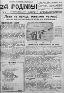 . •*. р'мь немецким оккупантам! К Р А С Н О Ф Л О Т С К А Я Г А З Е Т А Прочти и передай товарищу. воокрвсѳньа 2 апреля 1944 г. „Не было еще в истории войн \случая, чтобы араг сам прыгнул \в пропасть. Чтобы выиграть войну, нужно подвести против­ ника к пропасти и столкнуть его туда*. (Из орйіша 15 Верховного Главнокомандую­ щего Маршала Советского Союза И. СТАЛИНА), Лети на немца, товарищ летчик! МЫ НЕ ДОПУСТИМ ЛЬДА И ВОДЫ НА АЭРОДРОМАХ Первостепенная задаче , В любом деле большое зна- • чение имеет смекалка и изо- Зретлтельство тем более сей Лас, когда наша доблестная Красная Армия наносит сок эуиштельные удары по немец­ ко-фашистским захватчикам. Каждый советский патриот сейчас думает, как лучше делать, чтобы достичь боль ;оих результатов в любом деле, j Сейчас на летном поле ра- отает много машин и меха­ низмов. Как их це іесообразнее спользовать, чтобы достичь ольшей производительности руда? Подумай над этим, боец! едь на тракторе, снегопогруз- ике, грейдере, автомашине зеготаске работаешь ты. Вы­ нимай из техники все, что я» может дать. Но делай это шеючи, по-хозяйски. I Вот как поступает в этом угнетении младший сержант полихин. ві На снегопогрузчике нож за­ пивался в землю и ломался, гов. Аполихин изобрел нолоз- \іі, которые предохраняют нож ;гг проникновения в землю. И Сержант Хромов сделал при- и’.Юсобленне, сокращающее срок земонта снегопогрузчика. Бой- і ы подразделения лейтенанта т. Грибкова приспособ ил.! сне- );ЯасКі! (Л;, убо{іКИ Н ОЛЬКО кыхлого, но и укатан"'.' > .та. Б ойцы передового звена на > снегоразгрузке тт. C koj оход , Деревягин, Росенко заботливо расчищают подъездные пути после каждого рейса. Чтобы машина не буксовала, они подложили доски Шофер дово­ лен, и бойцы довольны, что білсті о идет слаженная работа. Однако, передовой опыт, смекалку перенимают не все. Ночему, например, т. Пшехо- жев безразлично относится к своей машине. Он не следит за ней и не чистит. Оттого часто машініа отказывает, и шофер уезжает «лечиться» в бокс. Пора понять Ишехожеву, что бережное, заботливое отно­ шение к технике—залог успе­ хов в труде. К этим новым успехам и должен стремиться каждый боец! Наши славные летчики, вы­ полняя приказ № 16 товари­ ща Сталина, день и ночь бьют немцев на Севере. Наш святоі долг, не щадя своих сил, при меняя все свое уменье и сме­ калку, всеми мерами помогать им. Лучшей помощью сейчас является быстрая уборка ных полей от снега. Это —первостепенная задача бойцов аэродромной службы Тле решим же ее, товарищи, < честью! СЧАСТЛИВОГО ПУТИІ Поступил приказ. С чисто убранного бойцам» аэродромной служб» летного поля самолет поднимается в воздух. Он наберет высогу и возьмет курс к фашистским базам. Счастливого пути! Не­ си смерть врагу, то­ варищ летчик, ч но:і- враіцлйся с победой! Нас. Іі Цейтлина. I Летное поле освобождается от снега лет- ЛЕТЧИКУ В поднебесье ты взлетаешь, Сокол летчик боевой. Беспощадно вражью стаю Бьешь и летом и зимой. С грузом бомб и днем и ночью Ты на запад кур с берешь И фзшистам, д р у г наш летчик, Месть ж е с т о к ую несешь. И когда ты вылетаешь — Будто мы летим с тобой. К немцу ненависть святая Нас зовет на труд любой. Мы всегда тебе поможем В битвах яростных с врагом. Смелый сокол, д р у г хороший , Мы тебя не подведем. Вот весна наступит вскоре, Д р уж н о встретим мы ее. Д о весны очистим поле, Поле летное твое. Поднажмем наляжем И отсту