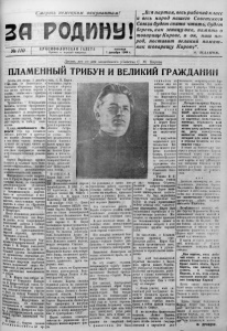 { ■ ' хи ч оккупантам! З й № 1 1 0 К Р А С Н О Ф Л О Т С К А Я Г А З Е Т А Прочтя и передай товарищу. пятница 1 декабря 1944 г. „Вся партия, весь рабочий класс и весь народ нашего Советского Союза будет свято чтить, будет беречь, как зеницу ока, память о товарище Кирове, и он, наш на­ род, поставит великий памят ­ ник товарищу Кирову * . А. Ж Д А Н О В . Десять лет со дня злодейского убийства С. М. Кирова ПЛАМЕННЫЙ ТРИБУН И ВЕЛИКИЙ ГРАЖДАНИН Десять лет назад I декаоря 1934 года, в Ленинграде, в Смольном оборвалась прекрас­ ная жизнь любимца партии и народа, пламенного трибуна большевизма Сергея Мироно­ вича Кирова. Троцкистам - бухаринские бандиты, агенты презренного фашизма убили страстного несгибаемого и непримиримо­ го,борца за ленинско-сталин­ скую линию- партии, борца за дело народа, за победу соци­ ализма. В лице незабвенного <?Ли раныча (так его называли любовно, рабочие и крестья­ не) партия Ленина— Сталина и вся наша страна потеряли лучшего из лучших сынов со­ ветского народа, отдавшего вею свою прекрасную жизнь делу социалистической револю­ ции. Сергей Миронович прошел большой и славный путь боль- шевика-подполыцика, профес­ сионального революционера ленинеісо-сталпнскогі школы. Шестнадцатилетним подрост­ ком в Уржуме Киров уже имел прочные связи со ссыльными революционерами. 18-летним юношей в Томске он вступил в большевистскую партию. Здесь он организовал и воз­ главил вооруженное восстание рабочих, выступивших против Царизма в ответ на «Кровавое воскресенье» (9 января 1905 г .] в Петербурге. .После поражения революции 1JOo г. наступили для Киро­ ва долгие годы напряженной подпольной работы в Сибири и.на Северном Кавказе, свя­ занные с преследованиями Ч&рской охранки, тюрьмами, ссылкой. Во время Февральской бур- іазно-демократической рево- ‘ С. М. Киров находился Владикавказе. Во главе не­ большой группы арестами, мни, С. М. Киров возглавил герои­ ческую оборону Астрахани от на­ ступления бело­ гвардейских пол­ чищ. Он опроте­ стовал предатель­ ское распоряже­ ние обер-бандита Троцкого о сдаче белогвардейцам Астрахани и с честью выполнил р ас и о ряжение Ленина: «Астра­ хань защищать до конца». Под его руководством войска Одиннад­ цатой армии при­ нимали участие во взятии Цари­ цына и потом со­ вершили поход на Северный Кавказ, громя деникинс­ кие белогвардей­ ские войска. В 1921 г. С. М. Киров был изб­ ран секретарем ЦК Коммунистической партии Азербайджана. В 1923 г.. на X I I партс.ъезде, С. М Кирова избрали членом ЦК РКЩб). С 1930 г. 0. М. К и р о в — член Политбюро ЦК ВКІІ(б). В декабре 1925 г. Цент­ ральный Комитет ВКІІ(б) пос­ тавил Сергея Мироновича К и ­ рова во главе ленинградской организации большевиков. Как верный сын ленинско-сталин­ ской партии С. М. Киров беспощадно громил троцкнстско- зиновьевскую и бухаринскую банду. Он сплотил ленинград­ ских большевиков вокруг ле- аияско -сталинско го Централь - ного Комитета нашей партии, вокруг товарища Сталина. Ленинградцы в лице Сергея большевиков I Мироновича видели непрнмири- передовых ра- . большевистские ряды, мя' Ъяса^л широким народным ассам подлинный смысл Фе- буржуазной револю- . > разоблачал меньшевиков 1 эсеров. М. Киров был избран де >ного Кавказа лега — на оТ°в от Невер э« Всероссийский съезд Со- S >B' B Ретрограде . » вояТз ? ' * ™ ™ 6 Тябрьской Революции, ^адикавказ, °°льщеви СЬІ Gy Cef ePaoro Кавказа на борь- тейся п 
