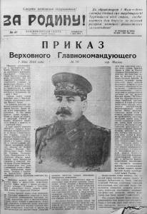 Смерть немецким оккупантам! за родина! № 41 К Р А С Н О Ф Л О Т С К А Я Г А З Е Т А Прочти н передай товарищу. понедельник 1 мая 1944 г. Да здравствует 1 М а я—- день смотра боевых сил трудящихся / Трудящиеся всех стран, соеди­ няйтесь для борьбы за полный разгром немецки - фашистских захватчиков! ИЗ ПРИЗЫВОВ ЦК 8КП(б) КО ДНЮ I МАЙ 1944 года. П Верховного Р И К А 3 Гл внокомандующего 1 Мая 1944 года " № 70 гор. Москва Товарищи кр а сно а рмей ­ цу ды и кра снофлотцы , с е р ­ жанты, офицеры и г е н е р а ­ лы, партизаны и партизанки! Трудящи е ся Со в е т с к о г о Союза! Бр а т ь я и сестры, в р е ­ менно подпа вшие под иго немецких у гн е т а т е л ей и н а ­ сильственно угнанные на фашис т скую к а т о р г у в Г е р ­ манию! От имени С о в е т с к о ­ го Правительс тва и нашей большевис тской партии при ­ ветствую и п о з д р а в л яю вас с днем '1 Мая ! Народы нашей страны встречают день 1 Ма я в о б ­ становке выд ающих с я у с п е ­ хов Красной Армии. " С о времени ра з грома не ­ мецких дивизий под Ст алин ­ градом Красная Армия ве ­ дет почти непрерывное на­ ступление. За это время Красная Армия прошл а с боями от Волги до Серета , от предгорий Ка в к а з а до Карпат, ис требляя в р аж е ­ скую нечис т ь и выметая ее с советской земли. В ход е зимней кампании 1У43-44 г г Красная Армия выиграла ис торич е скую бит ­ ву за Д н е п р и П р а в о б е р еж ­ ную Украину , сокрушил а мощные оборонит ельные у к ­ репления немце в под Л е н и н ­ градом и в Крыму , ум е лы ­ ми и с тр емительными д е й ­ ствиями преодолел а н ем е ц ­ кую оборону на водных р уб ежах — Южный Буг , Днестр , Прут , Серет. Почти вся Украина , _ Молдавия , Крым, Ленин г р ад с к а я и Ка ­ лининская области, з н а ч и ­ тельная часть Белоруссии очищены от н емецких зах- г' ватчиков. Р о д и н е в о з в р ащ е ­ ны ме т аллур гия юга , руда Криворожья , Керчи и Ник о ­ поля, плодородные земли м еж ду Дн е п р ом и Прутом. Из ф аши с т ск о г о рабства вызволены д е ся т ки миллионов сове тских л ю ­ дей. )*.. Выполняя велико е д ело ос вобожд ения родной земли от фашис т ских захватчиков . Красная Армия вышл а к нашим г о с у д а р с т ­ венным границам с Румынией и Ч е х о с л о в а ­ кией и п р о д о лж а е т теперь громить в р аж е ­ ские войска на территории Румынии . Успехи Красной Армии стали во зм ожны ­ ми, благодаря правильной стратегии и т а к т и ­ ке советского командования , бл а г од ар я вы­ сокому моральному д у х у и на с тупа т ел ьному . порыву наших бойцов и к ом анди ро в , благо ­ дари х о р ош ем у о снащению наших войск пер ­ воклассной советской военной техникой , бла- ! одаря в о з ро сшему и с к у с с т в у и выучк е на ­ ших артиллеристов , миномётчиков , танкистов, летчиков, связистов, саперов, пехотинцев, кавалеристов, разведчиков, Этим успехам в значительной мере с о ­ действовали наши великие союзники, Соеди ­ ненные Штаты Америки и Великобритания, которые держа т фронт в Италии против нем­ цев и отвлекают от нас значительную часть немецких войск, снабжают нас весьма ц е н ­ ным стратегическим сырьем и вооружением , подвергают систематической бомбардировке военные объекты Германии и подрывают, та ­ ким образом, военную мощь последней . Но успехи Красной Армии могли бы оказаться непрочными и они были бы с в е ­ дены на нет после перво го же с е р ь е з н о г о контрудара со с тороны противника , если бы Красную Армию не подпирали с тылу весь наш с о в е т с к и й народ , вся наша с трана . Кр 