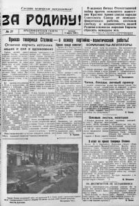 Смерть немецким оккупантам! за родину ; Ns2/ К Р А С Н О Ф Л О Т С К А Я Г А З Е Т А Прочти и передай товарищу. пятница 2 марта 1S45 г. В великих битвах Отечественной войны против немецкого нашест вия Красная Армия спасла народы Советского Союза от немецко- фашистского рабства,, отстояла свободу и независимость нашей Родины и помогла народам Европы сбросить немецкое иго. (Из приказа № 5 Верховного Главнокомандующего Маршала Советского Союза И. СТАЛИНА ). Приказ товарищаСталина Отлично изучить источник наших и сил и вдохновения Глубоко изучить приказ товарища Сталина, правильно осмыслить и понять все положе ния этого документа — значит вооружить себя могучим источ ником вдохновения на новые боевые дела во славу Родины. А потому так прилежно, с таким интересом читают и перечитывают но несколько раз наши бойцы приказ Вер ховного Главнокомандующего. Коммунисты и комсомольцы по могают личному составу в изу чении приказа. Вот краснофлотец-агитатор т. Мухин из подразделения, где парторгом т. Гребелкии. Сразу же, как только были получены газеты, т. Мухин прочитал при каз товарища Сталина бойцам своего подразделения и провел с ними беседу. Во время беседы спрашивал краснофлотцев все ли им понятно и обстоятельно об’яснял каждый вопрос. Так он помог краснофлотцу Коньковой и многим другим лучше понять приказ товарища Сталина. Сейчас он дополнительно раз’яспяет приказ отдельным краснофлотцам, беседует с ними индивидуально. Сам яв ляясь примерным, опытным шофером, коммунист -агитато р призывает товарищей к са моотверженному выполнению заданий, укреплению железной воинской дисциплины, бдитель ности. Новый патриотический под’ем бойцов, вызванный сталинским = --------- — : приказом, претворяется в кон кретные дела. Водители авто машин старший краснофлотец Андреев, краснофлотцы Фети сов и Калинин на подвозке мате риала нормы выполняли на 1 1 0— 120 процентов. Сейчас производительность их труда по высилась. Нормы свои они вы полняют на 130 процентов и больше. Перевыполняются нор мы и бойцами, занятыми на раз личных работах. Именно так на до агитировать! Каждому агита тору надо добиваться того, что бы его слова но раз’яснению приказа товарища Сталина под нимали бойцов на решение кон кретных задач части, подразде ления. В этом большом и благород ном деле агитаторам должны по- деловому помогать партийные и комсомольские организации. Ча ще собирать их для обмена опытом, оказывать помощь в подборе материалов и подготов ке к беседам. В то же премя необходимо требовать от всех коммунистов и комсомольцев еще более активного участия в раз’яснешии приказа № 5 товарища Сталина. Помочь краснофлотцам глубо ко изучить исторический приказ товарища Сталина и повседнев но показывать личный пример выполнения указаний нашего вождя и полководца — важней шая обязанность каждого ком муниста и комсомольца. в основу партийно-политической работы! КОММУНИСТЫ-ЯГИТЛТОРЫ Приказ вождя помогает Приказ № 5 В е р х о в н о г о Главнокомандующего Маршала Советского Союза товарища Сталина имеет большое значе ние и для повышения нашего идейно-политического уровня Глубокий по содержанию он помогает еще лучше пони мать величие побед, одер жанных Красной Армией и Военно-Морским Флотом над проклятой немчурой— ,говорят бойцы. Растет интерес к этому ис торическому документу. Партийная о