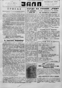 № 27 2 апреля 1944 г. воскрееенЬе К р а с н о ф л о т с к а я г а з е т а П Р О Ч Т И I I І І Н Р К Д А И Т О I! Л Р I I І Д У Верховного і Г? *Т| 5-5 JtJLlS о 1 1 о командующего иЛ .ІЛ ІНОВС ІЮМУ 1 енералу армі Войска 3-го УК Р АИ Н С КО ГО фронта, развивая наступление, овладели крепостью и городом ОЧА­ КОВ — важным опорным пунктом обороны немцев, запирающим вход в Днепровско-Бугский лиман. В боях за овладение ОЧАКОВ отличились войска генерал-полковника ЦВЕТАЕВА, полковника НИКИ­ ТИНА, полковника ДОРОТЕЕВА, артиллеристы пол­ ковника МАЗОВСКОГО, подполковника МОРТНОВА, саперы полковника ФУРСА и моряки подполков­ ника НЕЙМАРКА. В ознаменование одержанной победы соединения и части, наиболее отличившиеся в боях за освобож­ дение ОЧАКОВА, представить к присвоению наиме­ нования «ОЧАКОВСКИХ и к награждению орде­ нами. Сегодня. 31 марта, в 20 часов столица нашей Родины МОСКВА ог имени Родины салюіует доб­ лестным войскам 3-го УКРАИНСКОГО фронта, ов­ ладевшим ОЧАКОВОМ, — двенадцатью артиллерий­ скими залпами из ста двадцати четырех орудий За отличные боевые действия ОБЪЯВЛЯЮ БЛА­ ГОДАРНОСТЬ всем руководимым Вами войскам, участвовавшим в боях за освобождени е ОЧАКОВА. Вечная слава героям, павшим в боях за свободу и независимость нашей Родины! Смерть немецким захватчикам! Верховный Главнокомандующий Маршал Советского Союза И. СТАЛИН. марта 1944 года. 31 ПОСТ Г Д А ДНЕВАЛЬНОГО " ПОСТ От Советского Информбюро ОПЕРАТИВНАЯ СВОДКА ЗА 1 АПРЕЛЯ В течение 1 апреля юго-заиаднее города Тарнополь наши войска вели наступательные Сон, в ходе котарг,/: шладелі. районным центром Тарноиольской области городом Подгайцы. а также заняли более 30 других населенных пунктов, среди которых крупные населенные пункты Завалув. Голяіиув. Товстобабы, Коньчаки. Крымидув, Тумиж, Мен д зы гуж а п железнодорожные станции Комаровка, Нижнюв , Олешув К югу от города Каменец-Подольска наши войска овла­ дели населенными пунктами Недобоевцы. Пашковцы, Ставчаны, Д о лж о к , Динауцы, Малинешти, Ко­ шелеву , Форостна и ворвались в город Хотин, где завязали уличные бои. На Кишиневском направлении наши войска, преодоле­ вая сопротивление и контратаки противника, продолжали вести наступательные бон, в ходе которых заняли 30 насе­ ленных пунктов, среди которых крупные населенные пункты Мындрешти, Теленешти, Д ер еж ени , Негурени , Скорцени , Гидулени, Чинишеуцьі, Екимауць, Мо­ кра, Топалы, Черна. На Тираспольском направлении наши войска, продол­ жая наступление, овладели районным центром Одесской области Троицкое, а также с боями заняли более 60 дру­ гих населенных пунктов, среди которых крупные населенные пункты Новоселовка, Кохановка , Денисовка, Ни­ колаевна, Викторовка, Каминское. На Одесском направлении наш'к войска, преследуя отсту­ пающего противника, с боями заняли более 100 населенных пунктов, ь том числе крупные населенные пункты Черный Куш, Шабельник. Бинюки, Демидово, Анатоль- евка , Котовского, Нейково, Черногорка. Серб ка, Капитановка, Нельзац, Тишино, Блюмен- фелъд, Тузлы, Коблево , Карабаш, Аджиаска и железнодорожные станции Рауховка. Мариново . Серб ка. Отстуиая под ударами наших войск, противник песет большие потери в живой силе и технике. На других участках фронта — беи местного значения. В течение 31 марта наши войска подбили и уничтожили 33 немецких танка. В воздушных боях и огнем зенитной артиллерии сбито 86