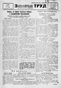 ЧЕТВЕРГ 5 апреля 1945 года >й 14 '1304 Цена нимера 15 нон. 3 'Л£Ш£ вВЗШШ&І^Ёйі Пролетарии всех стран, соединяйтщь! ТРУД Ж •і. * ф О Р г я н Кольского PR ВКП (б ) и районного Совета депутатов трудящихся ГОД ИЗДАНИЯ 13-й <- г д---т - іуяи итем —юиіняиииайр Вперед, за новые трудовые победы в предмайском соревновани ! Обращение коллектива 2- ко всем трудящимся Дорогие товарищи! Приближается великип праздник трудя­ щихся -Первое Мая. Еще в мирное время у советских лмцегі прочно вош юв традицию встре­ чай. мту '.шаменателі.иукі дату новыми тру­ довыми успехами, новьы под‘емом социалисти­ ческого соревновашиг, всесторонним улучше­ нием своей работы. В военное время ІІервомай, как и другие наши праздники, стал днем мо­ билизации всех па них сил на помощь фронту, па разгром врага. Нынче мы будем справлять радостный первомайский праздник в обстановке блестя­ щих исторических побед Красной Армии, ко­ торая громит немецких захватчиков в их соб­ ственном логове. Но и сейчас, когда полная победа над врагом уже близка, мы не можем ослаблять своих трудовых усилий. И теперь, когда Красная Армия победоносно движется по вражеской земле, освободила оккупирован­ ные Гитлером страны Европы, паша жизнь и работа определяются лозунгом: «Все для фрон­ та!». Товарищ Сталин в дни войны не раз да­ вал высокую оценку труду советских людей, помогающих Красной Армии громить врага. В повседневной работе мы должны закреплять свои успехи, чтобы заслужить новую похва­ лу любимого вождя. Приказы Верховного Главнокомандующе­ го товарища Сталина почти ежедневно возве­ щают об исторических победах советского ору­ жия. Каждый работник советского тыла, слу­ шая эти приказы, хочет быть достойным сво­ их братьев-фроитовнков и в ответ па благо­ дарность вождя героическим бойцам и офице­ рам трудиться еще упорнее. Так поступают и люди нашего коллектива. В результате этого наш район, выполняющий ответственную рабо­ ту по разгрузке кораблей, неоднократно за­ воевывал первенство в Мурманском порском порту. В феврале все бригады района спра­ вились с заданием, на трое суток раньше сро­ ка выгрузили фронтовые грузы с пароходов, сменно-суточный план выполнялся на 121,7 процента, средняя выработка на грузчика составила 10 тонн в смену. Нормы коллекти­ вом выполняются на 144,1 процента. За ре­ зультаты, достигнутые в феврале, району при­ суждено переходящее красное знамя предприя­ тия. Но пас не обольщают ути успехи. Для ускорения полной победы над врагом нужно сделать неизмеримо больше. Мы знаем, что у нас еще есть и неполадки. Например, неко­ торое количество вагонов обработано с прос­ тоем, имеются случаи производственного бра­ ка п не всегда полностью используются ме­ ханизмы. Поэтому каждый из нас прилагает все силы к тому, чтобы работа района улуч­ шалась изо дня в день, чтобы грузы фронту и тылу шли еще быстрее. го района морского порта Мурманской области j Дорогие товарищи, с этой целью мы вступили в предмайское социалистическое со­ ревнование, взялись за подготовку трудовых подарков к великому празднику. Для улучше ния работ”, .мы будем внедрять метод Егора Агаркова, практиковать стахановские вахты, ширить между сменами, бригадами, между работниками отдельных профессий борьбу за высокие производственные показатели. Наши обязательства в предмайском со­ ревновании таковы: 1. П овысить произв