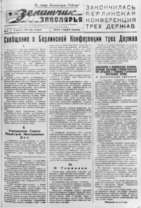 За f* Л '1 иоветсную го с ‘ г ГѴ U И Л А С Ь К Р А С Н О Ф Л О Т С К А Я Г А З Е Т А № 61 3 а в г у с т а 1945 го д а , пятница Прочти и передай товарищу. і|кк*ян дамаю Г “ О čf/гтіФ Л и L J З гч , r h Г"” * 5 ; £. I. 6 : 1 с. Г L - Р Е Х Д Е Р Ж А В онференции I. 17 июля 1945 г. Президент Соединенных Штатов Америки Гарри С. Трумэн, Председатель Совета Народ ных Комиссаров Союза Советских Социалистических 1 'еспублик Генералиссимус И. В. Сталин п Премьер- Министр Великобритании Уинстон С. Черчилль вместе с г-ном Климент Р. Эттли встретились на трехсторон ней Берлинской Конференции. Их сопровождали Ми нистры Иностранных Дел трех Правительств В. М. Молотов, г-н Д. Ф. Бирнс и г-н А. Иден, началь ники штабов и другие советники. В период с 17 по 25 июля состоялось 9 заседаний. После этого Конференция была прервана на два дня, на то время, когда об’являлиеь результаты общпх выбо ров в Англии. 28 июля г-н Эттли вернулся на Конференцию в качестве Премьер-Министра в сопровождении нового Министра Иностранных Дел г-на Э. Бевина. Состоялось еще 4 заседания. За время Конференции имели место регулярные встречи Глав трех Правительств, сопро вождаемых Министрами Иностранных Дел и регуляр ные совещания Министров Инострапных Дел. Комиссии, назначенные совещанием Министров Иностранных Дел для предварительной подготовки во просов, также заседали ежедневно. Заседания Конфе ренции происходили в Сесилиан-Хоф, близ Потсдама. Конференция закончилась 2 августа .1945 года. Были приняты важные решения и соглашения. Имел место обмен мнениями по ряду других вопросов. Обсуждение этих проблем будет продолжаться в Совете Министров Инострапных Дел, созданном этой Конферен цией. Президент Трумэн, Генералиссимус Сталин и Премьер-Министр Эттли, покидают эту Конференцию, которая укрепила связи между тремя Правительствами к расширила рамки их сотрудничества и понимания, с новой уверенностью, что их Правительства и народы, вместе с другими Об’единенными Нациями, обеспечат создание справедливого и прочного мира. II. Учреждение Совета Министров Иностранных Д е л А. Конференция достигла соглашения об учреж дении Совета Министров Иностранных Дел, представ ляющих пять главных держав, для продолжения необ ходимой подготовительной работы по мирному урегули рованию и для обсуждения других вопросов, которые по соглашению между участвующими в Совете Прави тельствами могут время от времени передаваться ьовету. Текст соглашения об учреждении Совета Министров Иностранных Дел гласит: 1- Должен быть учрежден Совет в составе Мини- " ров Иностранных Дел Соединенного Королевства, ою.іа Советских Социалистических Республик, Китая, Ранции и Соединенных Штатов Америки. тг ; а) Нормально Совет будет заседать в Лондоне, ко- * * являться постоянным местом пребывания единенного Секретариата, подлежащего созданию Со- том- Каждого Министра Иностранных Дел будет со- ра^В0ЖДать Заместитель высокого ранга, должным об- уполн°моченный вести работу в отсутствие его, нистра Иностранных Дел, и небольшой штат техни ческих сотрудников. не п ^ервое засеДание Совета состоится в Лондоне вать°ЗДНее ^ сентября 1945 г. Заседания могут созы- иожно fi ° ° ^ ечу соглаінению в других столицах, о чем .j° удет время от времени договариваться. вета ^ качестве немедленной и важной задачи Со- дЛя j,Ha нсго возлагается составление мирных договоров Для пТаЛ1ш’ Румынии, Болга