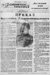 СМЕРТЬ НЕМЕЦКИМ ОККУПАНТАМ! ^ З А П О Л Я Р Ь Я К Р А С Н О Ф Л О Т С К А Я Г А З Е Т А № 32 1 м а я 1945 г о д а , в торник. Пр очти и передай товарищу. „Идет последний штурм гитлеровского логова1. (Из приказа ,\? 20 Верховного Главнокомандующего) П Р И К А З верховного Главнокомандующего / Мая 1945 года № 20 . ' Товарищи красноармейцы и краснофлотцы, сержанты и старшины, офицеры армии и флота, ге нералы и адмиралы! Трудящиеся Советского Союза! Сегодня наша страна празднует Первое Мая — международный праздник трудящихся. В этом году иэроды нашей Родины встречают пень Первого Мая в обстановке победоносного завер шения Великой Отечественной войны. Ушли в прошлое и не вернутся больше тяжелые времена, когда Кр, ';ная Армия отбивалась от враже ских зойск под Москвой и Ленинградом, под Грозным и Сталинградом. Ныне наши победоносные войска громят вооруженна з силы противника в центре Гер мании, дглеко за Бсрпмном, на реке Зльба. За короткий срок освобождены Польша, Венгрия, большая часть Чехословакии, значительная часть Австрии, столица Австрии — Вена. Красная Армия овладела при этом Восточной Пруссией гнездом немецкого империализма, По меранией, большей частью Бранденбурга и главными районами столицы Германии — Берлина, водрузив над Берлином знамя победы. В результате этих наступательных боев Красной , Армии немцы потеряли в течение трех— четырех ме сяцев более 800 тысяч солдат и офицеров пленными и около миллиона убитыми. За это же время части Красной Армии захватили и уничтожили до 6.000 вражеских самолетов, до 12.000 танков и самоход ных орудий, более 23.000 полевых орудий и огром- , ное количостзо гругих видов вооружения и снаря жения. Следует отметить, что в этих боях бок о бок с Красной Армией успешно наступали против общего врага польские, югославские, чехословацкие, бол гарские и румынские дивизии. В результате сокрушительных ударов Красной Армии немецкое командование было вынуждено пе ребросить на советско-германский фронт десятки ди визий, оголяя целые участки на других фронтах. Зто обстоятельство помогло войскам наших союзников развернуть успешное наступление на западе. При этом путем одновременных ударов против немецких войск с востока и запада войскам союзников и Крас ной Армии удалось рассечь немецкие войска на две, оторванные друг от друга части и осуществить сое динение наших и союзных войск в единый фронт. Не может быть сомнения, что это обстоятельство означает конец гитлеровской Германии. Дни гитлеровской Германии сочтены. Более по ловины ее территории занято Красной Армией и вой сками наших союзников. Германия лишилась важ нейших жизненных районов. Оставшаяся в руках гитлеровцев промышленность не может снабжать немецкую армию достаточным количеством вооруже ния, боеприпасов и горючего. Людские резервы не мецкой армии исчерпаны. Германия полностью изо лирована и оказалась в одиночестве, если не считать ее союзницы — Японии. В поисках выхода из своего безнадежного поло жения гитлеровские авантюристы идут на всевоз можные фокусы вплоть до заигрывания с союзника ми, стремясь вызвать разлад в лагере союзников. Эти новые жульнические трюки гитлеровцев обрече ны на полный провал. Они могут лишь ускорить раз вал немецких войск. Лживая фашистская пропаганда запугивает не мецкое население вздорными россказнями — будто армии Об’единенных 
