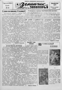 2августа 1944 г. Среда № 64 t iU M V I U K L - ^ З Я Л Ѳ Я І Р Ь Я СМЕРТЬ НЕМЕЦКИМ ОККУПАНТАМ ! Прочти и передай товарищу Краснофлотская газета Слава великому Сталину! Краснофлотцы, сержанты и офицеры ветствуют великого вождя и полководца. при- Ука.і Президиума Верховно го Совета Союза ССР о награ ждении товарища Сталина ор деном «Победа был воспринят личным составом нашего сое динения с большой радостью и воодушевлением. 30 июля во всех частях и подразделе ниях прошли митинги лично го состава, на которых наши краснофлотцы, сержанты и офицеры продемонстрировали свою любовь и преданность большевистской партии и товарищу Сталину. Личный состав ПВО еще раз заверил товарища Сталина в том, что не один фашист ский стервятник не пролетит безнаказанно над родными бе регами Севера. Выступивший на митинге краснофлотец т. Трухачев за явил: „В суровые годы Оте чественной войны 11. В. Сталин воодушевил нас на беззаветную борьбу с заклятым вра гом советского народа. Това рищ Сталин организовал и ведет наш народ к полной и окончательной победе над про клятыми захватчиками. Исключительно велики за слуги товарища Сталина в де ле защиты Советского госу дарства и в организации раз грома врага. В ответ на награ ждение товарища Сталина мы обещаем отдать все силы., а если потребуется и жизнь для окончательной победы над оккупантами". Краснофлотец т. Аристова— кандидат в члены ВКИ(б) те лефонистка— выступила на ми тинге с призывом к девушкам- краснофлотцам образцово нести вахту. Заступив после митин га на вахту, она личным при мером подтвердила свои слова, вахту несла отлично. После митинга краснофло тец Щекатуров подал заявле ние с просьбой о приеме в ряды партии Ленина— Сталина. Отличным несением службы, повышением бдительности от ветили краснофлотцы на исто рический указ Президиума Верховного Совета о награж дении Маршала Советского Со юза товарища Сталина орде- I ном «Победа». I Капитан И. Штукатуров. ДЕВУШКИ—ВОИНЫ год т. Холмова рабо-1 носятся к службе, не заботят тает у телефонного аппарата принимая донесения с постов ВНОС, оповещая противовоз душную оборону о воздушной опасности. Прекрасно она изу чила свою специальность, образ цово выполняет воинский долг. Ее ценит командование, ува жают товарищи. На груди де вушки-воина красуется медаль «За боевые заслуги». Несколько дней тому назад, за безупречную службу и за успехи в совершенствовании по специальности, награждены значком «Отличный связист» радистка т. Екимчева, телефо нистка т. Якимова; звание старшего краснофлотца при своено писарю т. Родионовой. В каждом подразделении не мало таких же примерных де- вушек-краснофлотцев. Все свои силы, знания, весь свой мо лодой пыл отдают они делу завоевания победы. Лучших из них Родина награждает, командование повышает в зва нии и по службе. Спасибо,— им скажет советский народ, когда отгремит гроза освобо дительной войны. Почетом и уважением окружит он тех, кто вернется домой с прави тельственной наградой, с золо той нашивкой на погонах— верным признаком честного и умелого служения отчизне. Стыдно будет девушкам- краснофлотцам тт. Карманов- ской, Кошпиой, Коновниковой, Щербаковой. Они нерадиво от- Г е н е р а л у а р м и и Ч Е Р НЯХОВСКОМУ ,,Войска 3-го Белорусского фронта, сломив упорі&е сопротивление про тивника, штурмом овладели горо дом и крепостью Каунас (Ковио) важны