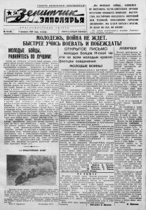 СМЕРТЬ НЕМЕЦКИ Я ОККУПАНТАМ ! З Я І Ш І Ш Ь Я КРАСНОФЛОТСКАЯ ГАЗЕТА № 10 (36) 3 февраля 1944 года, четверг. П РОЧ ТИ И П Е Р Е Д А Й Т О В А Р И Щ У „МЫ МОЛОДЫЕ БОЙЦЫ... КЛЯНЕМСЯ НЕ ПОСРАМИТЬ ЧЕСТИ СОВЕТСКОГО ОРУЖИЯ. НЕУСТАННО ПОВЫШАТЬ ВОИНСКОЕ МАСТЕР СТВО, НАСТОЙЧИВО ОВЛАДЕВАТЬ ВВЕРЕННОЙ НАМ ТЕХНИКОЙ, ПОВСЕДНЕВНО УКРЕПЛЯЯ ДИСЦИПЛИНУ, МЫ БУДЕМ БИТЬСЯ С ВРАГОМ, НЕ ЩАДЯ НИ СИЛ, НИ ЖИЗНИ". (Из письма комсомольцев и молодежи Советского Союна товарищу Сталину). МОЛОДЕЖЬ, ВОИНА НЕ ЖДЕТ. БЫСТРЕЕ УЧИСЬ ВОЕВАТЬ И ПОБЕЖДАТЬ! МОЛОДЫЕ БОЙЦЫ, РАВНЯЙТЕСЬ ПОЛУЧШИМ! Сегодня мы публикуем от крытое письмо молодых бойцов Н-ской части ко всем молодым краснофлотцам соединения. Всего только два месяца прош ло с тех пор, как новички ста ли бойцами зенитных батарей и подразделений нашего соеди нения. С единодушным стремлением беспощадно бить врага, уско рить час его окончательного разгрома пришли они на воен ную службу. Каждый из них мечтал и мечтает о подвиге, славе. Эти патриотические меч ты и желания повысили их энергию в борьбе с трудностя ми боевой жизни и учебы. Очень многие молодые краснофлотцы в короткие сроки научились работать на боевых механизмах. Например, т. Кац овладел спе циальностью п уже участвовал в отражении налета немецкой авиации. Товарищ Фролов стал пулеметчиком, тт. ІІІергин, Пат- ров, Ипатов и другие самостоя тельно несут боевую вахту. В своем открытом письме молодые краснофлотцы заяв ляют, что они в кратчайший срок добьются военного мас терства, путем физической подготовки разовьют в себе необходимые воину качества выносливость, силу и волю; будут постоянно работать над повышением своего идейно-по литического и культурного уровня. Они призывают всех своих сверстников быстрее до стичь боевой зрелости, влить ся в ряды опытных зенитчи ков, отдать все силы, а если потребуется, то и жизни делу завоевания победы над немец ко-фашистскими захватчиками. Утот призыв найдет горя чий отклик в сердцах моло дых патриотов. Все новички живут той же мыслью, что и краснофлотцы, обратившиеся к ним с открытым письмом. Каждый из них готов на все, чтобы только ускорить наступ ление радостного дня победы. Каждый в тайниках своей ду ши лелеет мечту о подвиге, славе, отличии в боях за Ро дину. А «...когда человек лю бит подвиги, он всегда умеет их сделать и найдет, где это можно. В жизни... всегда есті место подвигам», — говорил Максим Горький. Путь к под вигам, славе, отличию — это верное служение Родине, неус танная боевая учеба, стро жайшая дисциплина, смелые и умелые действия в бою. Молодые краснофлотцы, сле дуйте примеру передовых во инов — ваших сверстников, быстрее овладевайте боевой техникой, перенимайте знания, опыт и навыки своих коман диров и старших товарищей, быстрее вставайте в один ряд с бывалыми бойцами, так же, как они, умело используйте всю мощь зенитного оружия против фашистской авиации. 1-й ПРИБАЛТИИСКИЙ ФРОНТ . Выполняя боевое заданно, гвардейцы-связисты заняли рубеж на одной из высот. 14 раз немцы ходили в контратаку на высоту и не добились успеха. Гвардейцы связисты, вытащив на бруствер 45-мм. пушку, расчет которой выбыл из строя, подбили из нее 4 танка „Тигр" и уничтожили 2і 0 гитлеровцев. На снимке: Группа героев связистов. На переднем плане сл е ва направо гвардии капитан Г. М. Дворянинов, гвардии рядовой Ф.Ф. Литвин и гвардии капитан И. А. Степанов в траншее на 