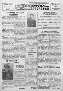 2 июля 1944 г. Воскресенье Ѣ. 54 СМЕРТЬ НЕМ ЕДКИМ ОККУПАНТАМ! ^ИОЛЯРЬЯ Прочти и передай товарищу Краснофлотская газета Спартакиаду проведем образцово! 9 июля—спортивные сорев­ нования. В их программе пре­ дусмотрены: большая н малая шведская эстафеты, прыжки в высоту, в длину, гранатомета^ ние, военизированный 20 кило­ метровый переход с полной боевой выкладкой и выполне­ нием в пути стрелковой зада­ чи. В этом смотре физической силы, выносливости и закал­ ки зенитчиков примут участие команды всех частей нашего соединения. В части, где комсоргом тов. Контуш, сразу же, как устано­ вилась теплая погода, во всю ширь развернулась физкуль­ турная работа. Краснофлотцы своими силами сделали пло­ щадку для волейбола и прыж­ ков в длину, поставили тур­ ник. Иная картина в части, где комсомольскую работу возглав­ ляет т. Низиков. Здесь лето не впесло почти никакого ожив­ ления в физкультурную рабо­ ту, Даже физзарядку здесь от­ менили. Вместо нее, те не­ сколько минут, которые пред­ назначены для того, чтобы ос­ вежиться и размять мускулы, тут используют для... уборки мусора. На вопрос почему в подраз­ делении ничего не делается для улучшения физкультурной работы слышен один ответ: —Некогда. Личный состав занят боевой подготовкой и выполнением заданий коман­ дования. В этих словах выражено не­ понимание того, что физкуль­ тура является частью боевой подготовки. Она—важное усло­ вие, обеспечивающее успешное выполнение любого задания командира. Опыт боев учит, что зака­ ленному, физически сильному, выносливому бойцу легче вое­ вать, легче добывать победу. Физически слабый, наоборот^ быстро выматывается, не вы­ держивает большого напряже- ния. Физическая немощь тако­ го бойца может явиться при­ чиной срыва боевых задач и даже гибели в бою самого во­ ина, а из-за него и его това­ рищей. Каждому воину надо вырабо­ тать в себе высокую выносли­ вость, способность не подда­ ваться утомлению при боль­ ших переходах и работе, при длительном пребывании без сна, без пищи, на холоде и в жаре. Каждому нужна сила, ловкость и смелость. Приобрести и развить эіи качества поможет бойцам физ­ культура. Недооценка ее не­ терпима. Одна неделя остается до дня спартакиады. Срок небольшой, но и он должен быть исполь­ зован для тренировок по всем видам спортивных состязаний, намеченных на 9 июля. Спартакиада должна произ­ вести перелом во всей физкуль­ турной работе. Успехи, кото­ рые на ней будут достигну­ ты,—закрепить и умножить, в каждом подразделении, каждой батарее—во всю ширь развер­ нуть физкультурную работу. Заполярное лето короткое. Дорожи каждым летпим днем, используй; его для укрепле­ ния здоровья, силы, развития выносливости, ловкости и сме­ лости. ПО с о в е т с к о й стране Герой Советского Союза Иван Иванович Афанасьев — капитан ордена Ленина парохода „Старый бо л ьшев и к"—с первых дней О т е ­ чественной войны непрерывно со ­ вершает рейсы дальнего плава­ ния. ( И. И. Афанасьев н а гр ажд ен о р ­ деном .Б ри тан ск ой империи" г р а ­ жданской службы четвертого класса. СТАХАНОВЕЦ З АПОЛЯРНОГО З ЕМЛ Е Д Е ЛИЯ Трактористу Мурманской МТС Василию Рамзайцеву только Іблет, а он еще в прошлом году был занесен в список передовиков за­ полярного земледелия. За почет­ ное первенство он борется и в этом году. Болотиста и вязка земля Запо­ лярья. Крепкие пни с густыми цепким
