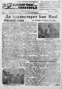 с м в р т ь н е м Е і і . к г ш 2 S £ £ B d £ E d M L Под знаменем Ленина, под m m n u e L . З а п о л я р ь я № 3 5 К Р А С Н О Ф Л ' 0 Т С К А Я Г А З Е Т А І мая 1944 года, понедельник. | прочти и ПЕРЕДАЙ ТОВАРИЩУ В£і* иѵ.гь' ^.«жаіясіѵг > ■ !.'inr.r.*iгигггмлпм водительством С т а л и н а — вперед за разгром немецких оккупантов и изгнание их из пределов наше >/ / Н- Родины! Из r.-jHSWR»"' ЦК ВКГМ.61 ка 3 5 &,; й 1944 года. авствует 1-ое Мая! ТРЕТИЙ БОЕРЫ ПЕРВОМАИ Сегодня третий военный Первомай. Его мы празднуем в дни грандиозных побед. Пе ред нашим мысленным взором проносятся картины пережито го за годы войны. Мы помним горькие дни от ступления. Черной тучей на висли над мирными городами и селами вражеские самолеты, сея повсюду смерть и разру шения. Немецкие танковые змеи ползли в глубь советской земли, стремясь поразить на шу Родину в самое ее сердце— Москву. Большие силы бросил бесно ватый фюрер против советского Заполярья. Более полутысячи машин носилось в заполярном Вебе. Немцы торжествовали, пред вкушали молниеносную победу. Жестокое и кровавое разоча рование ожидало надменных. «завоевателей а, опьяненных военными увесилительными про гулками по Западной Европе. Фрицы - «герои», получав шие железные кресты за Бель гию, Францию, Грецию, на Восточном фронте становились смертниками. В боях под Рос товом и Керчью, под Москвой и Калининым, под Тихвином и Ленинградом сотни тысяч фри цев .удостоены последнего крес та—осинового. Тысячи гитле ровцев полегли на сопках За полярья. Сотни летчиков наш ли свой бесславный конец от огня североморских истребите лей и зенитчиков. Таковы ито ги, с которыми мы встретили первый военный Май. t -ое Мая 1943 года мы от метили в обстановке еще более грандиозных побед. Советские войска окружили и уничтожи ли под Сталинградом две отборные немецкие армии, пленили свыше 300 тысяч фашистских солдат и офице ров, вышибли о к к у II а II т о в с территории, захваченной ими летом 11)42 года и заняли ряд г. ;■ ч ■’< ^пионов, оккупиро ванных немцами в 1941 году. Новые мощные удары нанесли вр ажеском у в о з д у ш н о м у флоту наши зенитчики и сталинские соколы. Гитлеров ская Германия встала перед своей катастрофой. Первое Мая 1944 года. Н а ш и в о й с к а в ы ш л и за государственную границу. Они быот немцев там, от куда захватчики пришли к нам с войной. Настал на на шей улице праздник! Сбыва ются вещие слова великого Сталина: ....гитлеровская фа шистская армия так же может быть разбита и будет разбита, как были разбиты армии На полеона п Вильгельма". Впереди еще более радост ный праздник — день нашей окончательной победы над ок купантами. Он недалек. —Напуган — на половину побит,— говорил А. В. Суво ров. Фриц и напуган и бит. Надо добить его! Гитлеровские летчики здорово бегают от зе нитного огня. Не давать им спасаться бегством! Сбивать, как только появятся в зоне обстрела! Недорубленный лес вырас тает. Недобитый враг соберется с силами. Добить немца! В его смерти—наша жизнь^ жизнь нашей Родины. Третий раз Первое Мая мы встречаем на фронте. Сделаем так, чтобы третий—был пос ледним. Следующий Май встре тим в кр у гу родных, люби мых. Все в наших руках! Точным огнем по врагу уско рим победу! НА ОРУДИИ ЧЕТЫРЕ З В Е З ДЫ Наводчик тов. Попов проводит беседу. Яркие лучи майского солн ца ласкают т е ми о з ед ен ую длинностволую пушку сверкаю щую четырмя красными звезда ми. Эго пушка расчета млад шего сержант