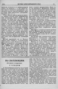 № 4. ВЕСТНИК КАРЕЛО-МУРМАНСКОГО КРАЯ. 9 промыслов исчисляется не одними размерами уловов и их ценности, т. к. оно самым т е с ным образом связывается одновременно с це лым рядом других отраслей народного труда на Севере: извоз, мореходство, судостроение , бондарное дело и т. д. Таким образом, морские промыслы являют ся главным о б ‘ектом всей прибрежно-мор- ской колонизации нашего Севера, на них основана вся жизнь, весь быт приморского населения. Следовательно, вопросы прибреж ного пока, быть может, еще чрезмерно ку старного лова, при решении всяких практи ческих и теоретических мероприятий имеют основное значение и умалять их, низводить на степень какого-то невнимания, игнориро вания, соиостовляя в то же время с новыми вопросами крупного глѵбевого— это значит просто поставить весь вопрос промыслово- морской колонизации побережье Белого мо ря и Ледовитого океана в угрожающее, ги бельное положение. Морские промыслы —глав ный стимул всей исторической колонизации Севера. Ярусный (крючковый) лов на Мурмане является пока главным и исключительным видом промысла рыбы. Количество ярусов на Мурмане исчисляется в настоящее время до 1000, дающих улов в средний промысловый год до 5 0 0 .0 0 0 п ѵ д , принимая ещ е во вни мание все те неблагоприятные условия, в ко торых протекает современное Мурманское рыболовство. Указанное количество, практи куемых на Мурмане ярусов неизменно возра стает и возрастет в скором времени до вну шительных размеров, в связи с ростом о с е д лого населения на Мурмане, а также и при- ПО ЛАПЛАНДИИ. (Из запасок экскурсанта). У Т У Н Д Р Ы . За Кандалакшей поезд часа полтора идетпо правому берегуодной из яамечаіельне^ших іек севера,—ІІиьы. Поверхность ржи на всем ее протяжении покрыіа белыми пенистыми гребнями вор* г- в, местами пере ходящих в настоящие водопады. Ле<шЙ берег горист и покрыт лес‘М, хотя верхние части эт“й горной цепи свободныот леса, а местами, па них даже отсутствует и травянипый покрой; совсем как беломорское побе режье между Кандалакшей и Умбой. По мере того suit т ш поезд бежит вверх по реке, т. е мы дви жемся на ctвер, горы несколько о«ступают к востоку, оставляя Нину среди слегка всхолмленной местности, явившейся, невидимому, в результате ледниковой дея тельности. Эта всхолмленная моренная местность со ставляет как бы предгорья Хибинекого массива. Вур- шлого сезонного промышленника. Кроме то го, мы наблюдаем в Мурманской промысло вой практике быстрый рост промысловой сна сти за счет увеличения самоіі снасти (яру са с 2 0 тюков на 3 0— 4 0 и более ) и подня тия отдельными ловцами добычи рыбы, в свя зи с усиленным введением на Мурмане па руси о-мот, ботов, что, несомненно, в ближай шее время сильно скажется на громадном увеличении современных уловов. Сам по с е б е ярѵсныіі лов рыбы постепен но во всех отношениях механизируется , со вершенствуется , идет твердым опытным пу тем по пути использования мелкого промыс лового флота посредством применения цело го ряда новых более совершенных орудий лова и т. д. Ярусный, т. е. мелко-кустарный промысел рыбы на Мурмане пока ещ е находится в ста дии развития и вряд-ли допустимо и осно вательно говорить о нем, как об отживаю щем промысле. На ярусном лове основано до сих нор все ;-)коно ми чес кое благо полу чие нор вежс кого Финмаркета и те громадные уловы рыбы, выбрасываемые им на междунаро