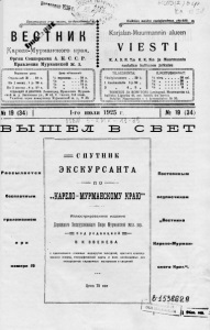 v '■ /' . . . v Пролетарии стран, ю г д и к я & т ^ р Ь ф Ь \! > k% t ................. ‘ Л ■ В E j t Н И К V r )^арѳло-]Ѵ[урманокого края. Орган Совнаркома А. К. С. С. Р. Правления Мурманской ж. д. Подписная цѳна: Отдельный Л й . . 50 к. На 1 месяц . 1 р. 50 к. На 3 месяца . 4 р. 50 к. РЕДАКЦИЯ И КОНТОРА: Ленинград, Правление Мурман ской ж. д. Лиговская ул., № 44, б. <елнкт, 6-й этаж. Телефон: через коммутатор Мурманской ж. д., № 30. Цена об'явлений: V 1 страница . . . 50 р. ‘/а . . . . 30 р. 7 ‘ « . . . 15 р. »/t „ . . . 8 р. Kaikkien maiden raatajarahvai, уМукЯЯі & ❖ ❖ ❖ X Karjalan-Muurmannin alueen V I Е S Т I К . A. S. N. Т:п К . К . N:n Ja M uu rm an n ln rautatien hailinnon julkaisu TILAUSHINTA: Yksityisnumero . . 50 k. 1 kuukaudelta 1 p. 50 » 3 , 4 . 5 . TOIMITUS JA KONTTORI: Leningrad, Muurmannin r.L hallinto; L ig o v k a 44, ent. Selekt, 6:s kerros. ILMOITUSHINNAT: V 1 siv u . . . . . 5 0 rpl. 1 / 2 ............................. 3 0 . 1/4 . • . • . • 15 . 1/8 . • • * • . 8 . Puheiin: Muurtnannin r. t. kommutalori № 30. № 19 (34) 1-го июля 1925 i\ № 19 (34) * 1 *■ ( !'■ В ЪэІ T T T E JL В С В Е Т Р а с с ы л а е т с я б е с п л а т ны м пр илож ени е * п р и ном ере 19 С П У Т Н И К ЭКСКУРСАНТА п о . „КАРЕЛО-МУРМАНСКОМУКРАЮ" И л л ю с т р и р о в а н н о е и з д а н и е Дорожного Экскурсионного Бюро Мурманской шел. дор. ; п о д р е д а к ц и е й = = - В. К. З В Е Н Е В А с приложением основных маршрутов экскурсий, краткого краевед ческого очерка, географической карты и всех необходимых для экскурсантов справочных маіериалов и сведений Цена 75 коп і П о с т о я н ны м п о д п и с ч и к ам н В е с т н и к а Ка р е л о -М у рм а н с к о г о Н р а к * ‘. & ' 4 5 Ы в 2 9