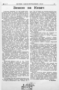 № 6—7 ВЕСТНИК КАРЕЛО-МУРМАНСКОГО КРАЯ 17 Зимою на Кивач Существует убеждение, что зима крайне небла гоприятное время для дальних загородних экскур сий. Недавний опыт Ленинградской 40-й Трудшколы показал, как pan, обратное. Лло проведено две та ких экскурсии—одна с 70 учащимися на Волхов- строй, другая, в количестве 10 человек, на водо пад Кивач и Кондострой (Карреспублика). Остановлюсь на последней. Организована она при содействии Дорожного Экскурсионного Бюро Мурманской жел. дор., предоставившего 50% скидки за проезд и забронированные места в вагоне. Вся экскурсия заняла 4 суток. Выехали экскурсанты из Ленинграда в ночь под новый год; на следую щий день, в 12 часов, сошли на раз'езде Суна Мур манской жел. дор. Рассчитывали итти на лыжах, но по прибытии на Суну, узнав о хорошей зимней дороге, лыжи оставили у стрелочника, а сами от правились пешком по р. Суне до дер. Чукалай (12 верст от раз'езда). В этой деревне состоялся пер вый привал. После Ѵ /2 часов отдыха прошли еще 7 верст, заночевав в дер. Верх. Вороново в кресть янской избе. Встретили большое радушие и госте приимство; уложили в чистой просторной комнате, предоставив матрацы, подушки, одеяла. Узнав, что мельник Кивачевской мельницы, живущий в дер. Вороново, рано утром идет на мельницу, решили восполі-зоваться им, как проводником, предвидя возможность сбиться с пути, так как еще с вечера поднялась сильная метель. Вышли в 5 час. утра; дороги настолько занесло, что до самого Кивача целых 7 верст лезли по колено в снегу,—это ока залась единственно трудная часть пути. Добрались на рассвете. У Кивача стоят две крестьянские избы, в одной из них мы и остановились. Звмою на Киваче экскурсантов не бывает—„подступы" к нему прокладывали по пояс в снегу. Величественная картина бешено устремляюще гося водопада с причудливыми образованиями, в виде громадных белых ледяных арок и скал, и мел кими брызгами, достигающими 12 саженей высоты, поразила нас. Решено было остаться на ночь, чтобы при лунном свете полюбоваться фантастической картиной, захватывающей и не поддающейся опи санию. Третий день провели в пути до лер Сопух и (8 верст от водопада) и в летальном ознакомлении с строительством на р. Сандалке, преследующим цель посредством 27 метр плотины и 2 километ ровой дамбы задержать выход оз. Сандала через р. Сандалку, повернув течение в сторону оз. Ниго, а оттуда через Кондопожский канал в Онежское озеро. От руководителей работ Сандальского строитель ства' мы получили не только самые исчерпывающие объяснения по истории возникновения проекта ис пользования местных водных сил, по произведен ным гидро-техническим изысканиям и выполненной работе, но нас познакомили и с подробными кар тами бассейна р. Суны и оз. Сандал. Все об‘ясне- ния давались очень охотно. В последний день при хорошей морозной погоде, не чувствуя никакой усталости, прошли 34 версты - 27 верст до Кондостроя и при осмотре его 7 верст. Уже на Сопухе мы получили довольно ясное представление о Кондострое, осталось ознакомиться с прорытием канала, бетонированием плотины и силовой станцией и др работами. Особенно заинте ресовались предполагаемым 28 метр, падением воды из сооружаемого канала в Кондопожскую губу. Это падение дает мощность свыше 6000 л. сил при использовании оз. Сандал и оз. Ниго. С присоеди нением же воды через проектируемый б вер. ка нал из Суны в о