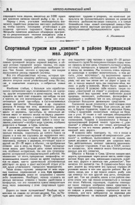 КАРЕЛО-МУРМЯНСКИЙ КРЯЙ 11 ствующего типа ледник, емкостью до 2.000 пудов для хранения запасов свежей рыбы и пр. и пр. Наряду с этим, учитывая необходимость вся­ ческого содействия развитию местного рыболовст­ ва, чтобы сделать последнее устойчивым и для создания прочного сырьевого базиса на месте, Желрыба наметила довольно обширную програм­ му по реорганизации техники сельдяного лова в Кандалакшском заливе; работа в этой области предстоит трудная и упорная, но конечные ре­ зультаты ее положительного влияния на развитие местного рыболовства скоро скажутся, и в самые ближайшие годы новый консервный завод в Кан­ далакше явится крупным центром развития рыбо­ обрабатывающей промышленности края. А . Ж и лин ск хш Спортивный туризм или „кэмпинг“ в районе Мурманской жел. дороги. Современная городская жизнь требует от че­ ловека громадной затраты нервной энергии, и об­ щие условия городской жизни таковы, что нерв­ ной системе городского работника необходим от­ дых. Чем ближе человек к природе, тем скорее восполняется расход нервной системы. ~ Все это общеизвестные истины, которые пре­ красно известны каждому работнику, жаждущему летнего отпуска после утомительной зимы. Но как, где и подешевле отдохнуть и набраться новых сил? Наиболее слабые, с больным или изработав­ шимся организмом едут, по возможности, на курор­ ты, другие отправляются в дома отдыха, часть вы­ нуждена за свой счет отдыхать где-нибудь на юге и тратить на это значительные суммы или огра­ ничиваться дачей где-нибудь в густо-населенных дачных местностях Ленинграда и др. городских, центров. Я между тем есть возможность дешево отдохнуть на лоне природы, вдали от городов, вдали от деревень, где-нибудь за несколько де­ сятков верст от всякого жилья на берегу уединен­ ного озера и отдохнуть с комфортом. Такая жизнь лагерем, жизнь под открытым небом и носит на- звание„кэмпинга“—особого вида туризма, особенно развитого в Канаде и Соед. Штатах. В условиях „кэмпинга" мне пришлось провести это лето в верховьях Печоры, где я прожил не­ сколько месяцев, поднимаясь до самого Урала на лодках и в них же спускаясь до населенных мест. Всего я проехал так, в лодке, около 720 верст, оста­ навливаясь изредка в деревнях, отстоящих одна от другой на 25—35 верст, а обычно—на прибрежных отмелях или в лесу, на берегу. Такая экспедици­ онная жизнь дает каждый день новые впечатле­ ния, особенно интересные, так как они сопровож­ даются интересной исследовательской работой. Но независимо от этого, прекрасные ландшафты, от­ крывающиеся вашим глазам во время передвиже­ ния на лодке, как-то удивительно успокаивающе действуют на душу и дают настоящий отдых уста­ лой душе утомленного городского трудящегося. Такая жизнь—лучшее лекарство от всех нерв­ ных тяжелых переживаний и она, при правиль­ ной организации, вовсе не сопряжена с какими либо лишениями. Наоборот, можно ночевать на речных песчаных отмелях с такими удобствами и комфортом, что это покажется прямо невероятным лицу, мало знакомому с этим спортивным туриз­ мом. Дорого ли такое путешествие? Вообще, путе­ шествие на лодках по речкам дешево. Так, на Пе­ чоре цена новой лодки около 25—30 рублей, и она подымает трех человек и пудов 15--20 допол­ нительного груза.По окончании поездки лодку мож­ но продать за пол-цены. Стоимость питания в месяц, по опыту э
