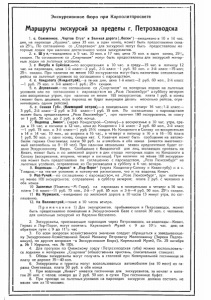 Экскурсионное бюро при Карполитпросвете Маршруты экскурсий за пределы г. Петрозаводска 1. с. Соломенное, „Чертов С т у л “ и Зеленая дорога(,,Пески“) — ежедневнов 10 и 14 час. дня, на пароходе „Кудома“, цена 3 5 коп. водин конец, может быть предоставленаскид ка 2 5п/0. По соглашению со „Спартаком" для экскурсий могут быть предоставлены мо торные лодки при наличии достаточного числа экскурсантов. 2. с. Ш у я, — ежедневно в5 час. 3 0 мин. и 17 час; цена 75 коп. водин конец, 25°/о скидки. По соглашению со „Спартаком1 могут быть предоставленыдля экскурсий мотор ные лодки на льготных условиях. 3. с Я/ігуба и Суйсаои, — по воскресеньям в 10 час. всреду— 15 час. в пятницу 12 час. на пароходах, цена 1-й класс— 2 руб., 2-й класс-1 руб. 50 коп. и 3-й класс— 75 коп; 2 5 % скидки. При наличии не менее 10Э экскурсантов могутбытьназначены специальные рейсы на льготных условиях по соглашению спароходством. 4. с. Кондопога (Кондострой), — вте-же дни, цена 1-й класс— 2 руб. 6 0 коп, 2-й класс — 1 руб. 75 коп. и 3-й класс— 1 руб.; 2 5 % скидки. 5. с. Деревянное, — по соглашению со „Спартаком" на моторных лодках на льготных условиях или по соглашению с пароходством на „Розе Люксембург" всубботу вечером или воскресенье утром, при наличии не менее 100 экскурсантов; плата I руб. вконец (может быть дешевле, если пароход не будет вынужден делать несколько рейсов, огра ничившись одним рейсом). 6. с. Сенная Губа, (Климѳцкий остров), — впонедельник и четверг 16 час.;1-й класс— 3 руб., 2-й класс— 2 руб и 3-й класс— 1 руб. 15 коп. По соглашению спароходством может быть предоставлена „Роза Люксембург", при наличии 100 экскурсантов, за плату от 1 руб. 5 0 коп. до 2 руб. воба конца. 7. Водопад „Кивач (через Кондострой— Сопоху)— в воскресенье в 10 час. утра, сре да в 15 час. и пятница в 12 час., ценадо Кондопоги 1-й класс-2 руб. 6 0 коп., 2-й класс — 1 руб. 7 5 коп. и 3-й класс— 1 руб; 2 5 % скидки. Из КондопогивСопоху повоскресеньям в 14 и 14 час. 10 мин., во вторник в16 час., вчетверги пятницу в 16 и в 1 6 — 10; плата 1 руб. 5 0 коп. в один конец, скидкинет. С Кивачем может быть сообщение на автомо билях гаража Онегзавода; плата 5 0 руб. за атомобиль воба конца (имеется многомест ный автомобиль на 8 — 10 чел). При наличии нескольких заявок предпочтение будет от даноЭскурсионному Бюро. Сообщение сКондопогой для лиц, желающих проехать на Кивач, может быть и по железной дороге вдни отхода моторныхлодок из Кондопоги в Сопоху (воскресенье, вторник, четверг и пятница). При наличии не менее 100 экскурсан тов может быть предоставлена по соглашению спароходством, „Роза Люксембург* на льготных усло'виях, отправление из Петрозаводска всубботу в6 час. вечера. 8. Водопады. — „Гирвас“ и „Пор-Порог“ (через Кондопогу-Сопоху и Кавас-губу) иве. Тивдию,— на тех-же условиях и потому-же расписанию, что и на водопад Кивач. 9. Роп-Ручей, — по соглашению спароходством, на „Розе Люксембург4, при наличии не менее 100 экскурсантов; отправление всубботу вечером; плата 2 руб. с человека в оба конца 10 Заонежье (Повенец— М.-Гора), на пароходах впонедельник и четверг в16 час. плата 1-й класс— 11 руб. 75 коп., 2-й— 7 руб. 8 5 коп и 3-й— 4 руб. 5 0 коп. 25°/о скидки. 11 На Мурманск, - ежедневно по железной дороге в 10 часов 13 минут утра, по сог лашению. 12. На Волховстрой,— -тоже в 10 часов вечера. Примечание 1) Для экскурсантов, прибывающих вПетрозаводск, может быть предоставлено помещение вЭкскурсионной Базе сплатой 3 0 коп. с человека, для шко