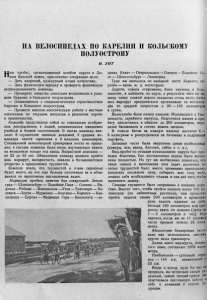 НА ВЕЛОСИПЕДАХ ПО КАРЕЛИИ И КОЛЬСКОМУ ПОЛУОСТРОВУ Н. УНТ Н а ш пробег, организованный штабом округа и До- * "мом Красной армии, преследовал следующие цели: — Дать здоровый, культурный отдых начсоставу, — Дать физическую зарядку и проверить физическую натренированность команды. — Проверить качество советских велосипедов в усло виях Карелии и Кольского полуострова. — Ознакомиться с социалистическим строительством Карелии и Кольского полуострова. — Провести массово-политическую работу с местным населением по текущим вопросам и решениям партии и правительства. Команда представляла собой не специально отобран ных рекордсменов, а людей, занимающихся ежедневно учебной и боевой подготовкой. В состав команды вхо дили: 5 слушателей военных академий, 3 средних ко мандира частей гарнизона и 6 младших командиров. Специальной велосипедной тренировки никто не прохо дил; в составе команды были люди, научившиеся ездить на велосипеде только год назад. Возрастной диапазон — от 22 до 33 лет. Объединило команду желание пройти весь маршрут, напористость, закалка и большевистское упорство в преодолении трудностей. Команда знала, что трудностей и очень серьезных будет много, но это еще больше сплачивало ее и объе диняло на выполнение поставленных задач. Маршрут пробега намечен был следующий: Ленин град — Шлиссельбург — Лодейное Поле — Олонец — Ви- длица—Реболы — Вокнаволок— Ухта —Тихтозеро — Ке- стенга —Лоухи— Мурманск —Апатиты— Кировск— Кан далакша — Сорока — Медвежья Гора — Кондопога — во допад Ки в ач— Петрозаводск — Олонец— Лодейное По ле — Шлиссельбург — Ленинград. Туда мы двигались по западной части Карелии, об ра тно— вдоль ж. д. магистрали. Дороги, говоря откровенно, были изучены, в боль шинстве, в кабинете, по карте, в результате чего по на шему плану плохой дороги оказалось очень мало; почти весь маршрут предполагался проходимым на велосипе дах со средней скоростью в 90 — 100 километров в сутки. Велосипеды были наших заводов: Московского и Пен зенского, серийного выпуска. Подготовка машин к про бегу заключалась в обкатке до 200 километров, пере делке багажников и снятии задних щитков. В походе багаж на каждую машину достигал б — 8 килограмм и распределялся на багажник и подрамный портфель. Запасные части были закуплены самые необходимые (камеры, оси, вилка, болтики, гайки и т. п.). Весь пробег по отзывам командования округа был про веден блестяще. Все поставленные задачи были выпол нены полностью. Но тут же необходимо сознаться, что такая оценка и выполнение всех задач достались не легко: трудностей было много; временами приходилось напрягать последние силы, собирать всю силу воли, лишать себя необходимого отдыха и сна для того, чтобы выполнить задачу. Главные трудности были сопряжены с плохими доро гами. Вместо того, чтобы пройти пешком около 100 ки лометров (по кабинетным расчетам), нам пришлось пройти пешком свыше 500 километров и временами даже ташить машины на себе. Больше 100 километров нам при шлось ехать по шпалам (делая по 7 — 8 километров в час). Был переход, когда мы за 11 ходовых часов прошли только 23 кило метра. Абсолютное бездорожье заста вило нас использовать м е с та м и другие виды транспорта. Длина всего маршрута, покры того нами, составляет 3903 кило метра. Наибольший — суточный пере х о д — 144 км, наименьший — 23 км. Везде и всюд